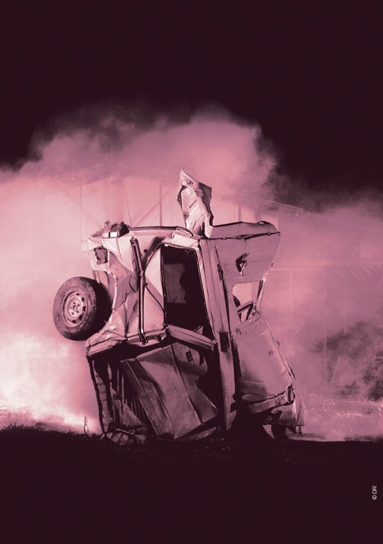 Un camion type Volkswagen Transporter, violemment détruit (compacté, éclaté, brûlé et broyé), gît au milieu de l’espace à proximité d’une vidéo de 15 minutes qui tourne en boucle. La carcasse semble extraite d’un accident impossible à analyser, ayant subi non seulement une compression, mais aussi une explosion avant broyage règlementaire dans un broyeur normé E40 de casse automobile. Dans une atmosphère allant du road-movie au western, en passant par la série B et la science-fiction, le film diffusé à côté de la carcasse témoigne sous la forme d’une fiction, de la transformation de ce camion en sculpture, et des étapes successives de sa métamorphose.